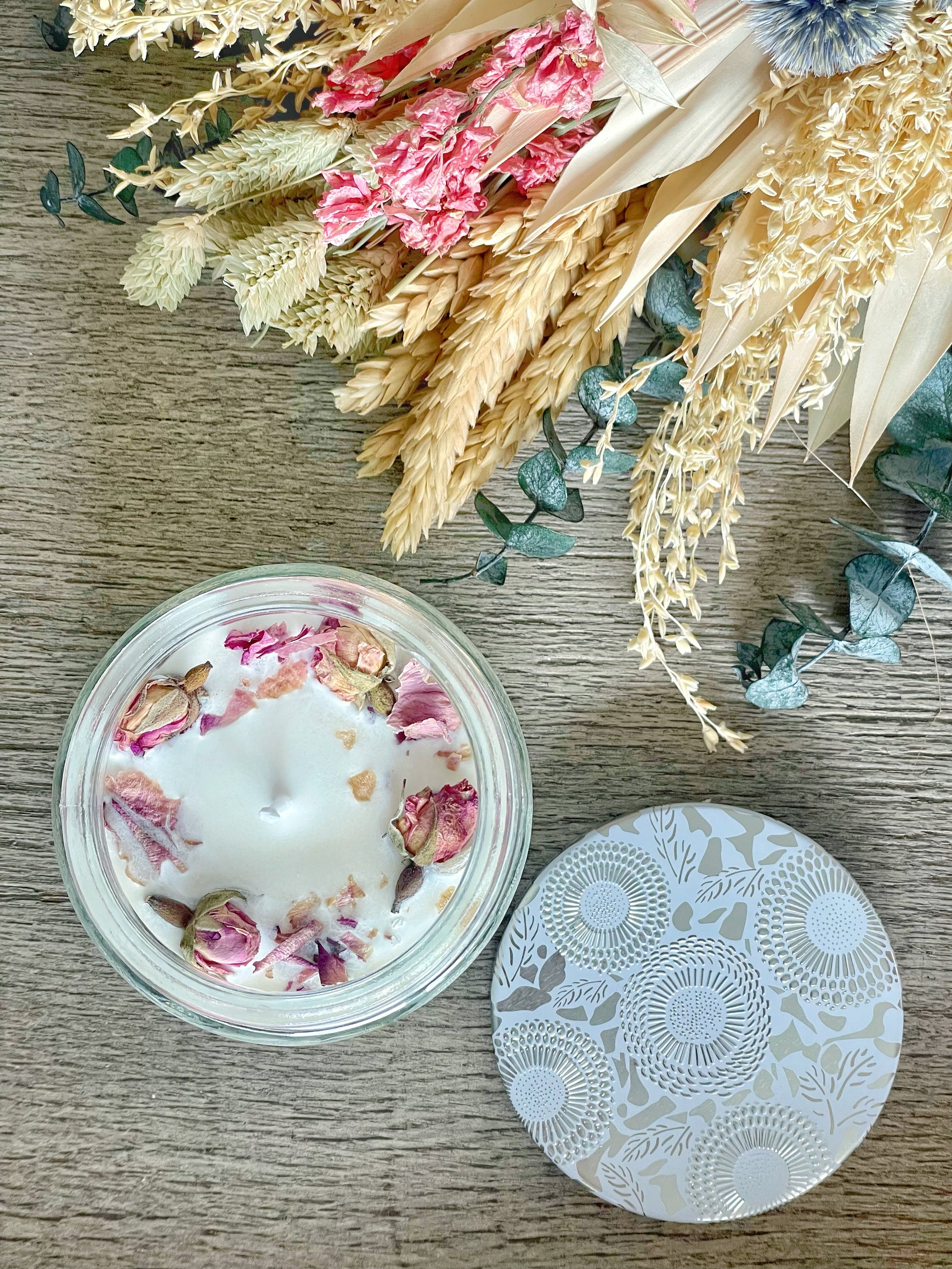 - Ingredients: Soy wax, cotton wick, essential oil, dried flowers